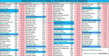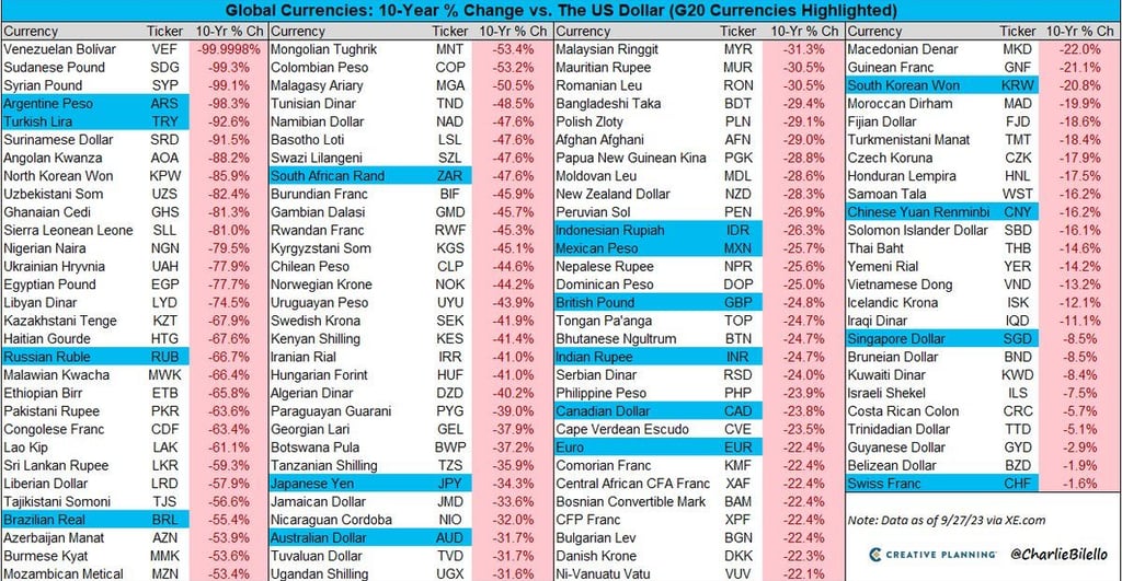 Look at this chart (credit: Charlie Bilello). This is how much your fiat money has lost in purchasing power vs the US Dollar.
